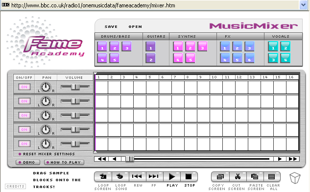 Casi todos utilizan un procedimiento similar. Presentan el aspecto de una mesa de mezclas simplificada en la que es posible cargar distintos loops, efectos sonoros y musicales, enrutarlos en una pista concreta, y manipular aspectos como el volumen de cada pista, el envío de señal, el panorama, silenciar las pistas (mute) y, excepcionalmente, incluir algún efecto. De este tipo son, por ejemplo: Fame Academy publicado por la BBC (requiere el reproductor Shockwave) o AudioMeister editado por la empresa SubKloda Design (permite además descargarse los ficheros fuente flash)