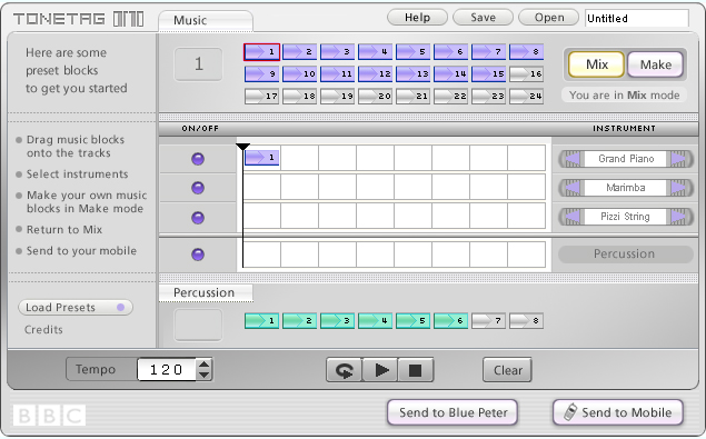Algunos de este tipo, ofrecidos por la BBC en su web dedicada a juegos musicales son: Composer, Drumsteps (un editor lúdico de patrones rítmicos “azorosos”) Tonetag, que permite crear piezas a partir de bucles o de la escritura personalizada en un piano roll, elegir quién interpretará cada pista seleccionando entre un listado de instrumentos GM (General MIDI) Su característica más novedosa es que permite remitir la composición a un espacio personal en la web de la BBC o crear un politono que se cargue en el teléfono móvil del creador o sus amigos.