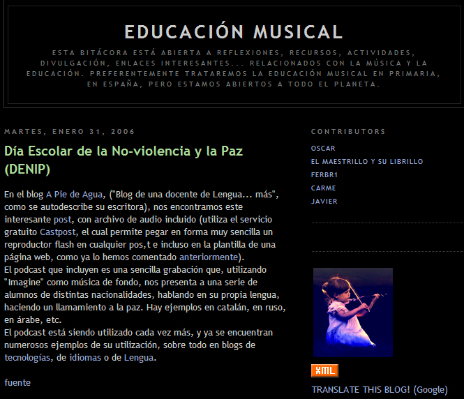 Los Blogs se están convirtiendo rápidamente en herramientas instrumentales para el Aula de Música. Con este tipo de páginas Web o cuaderno bitácora, podemos nosotros mismos publicar en Internet una serie de documentos y, a continuación, facilitar al alumnado la dirección en la que encontrarlos para que los consulten y participen activamente en su “reconstrucción” a través de sus comentarios, ampliaciones, etc.