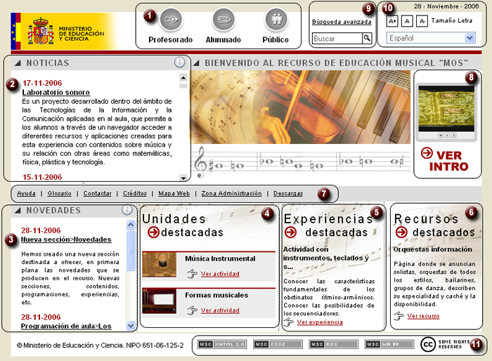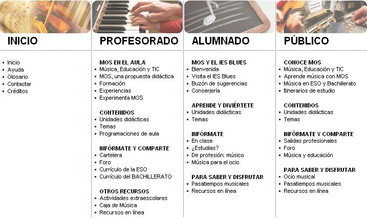 El recurso MOS está estructurado como un portal temático educativo para el área de Música. Como tal, pretende convertirse en un referente específico en esta materia, ofreciendo una plataforma en la que los miembros de la comunidad educativa (profesorado, educadores, alumnado y familias) puedan disponer de: