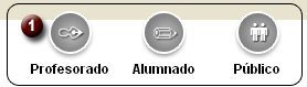 La entrada principal del recurso (pantalla de inicio) ofrece acceso a sus componentes generales, así como a los canales de acceso por perfil de usuario (Profesorado, Alumnado y Público).