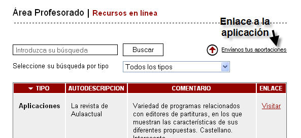 La siguiente actividad consiste en utilizar la aplicación que existe dentro del área de profesorado para introducir recursos en línea (ver secuencia de imágenes). Mete los datos de la actividad 4 correspondiente al apartado “Aplicaciones y recursos” del Módulo I . Después de haber enviado correctamente la aportación búscala dentro del apartado “Recursos en línea”. Realiza una captura de imagen y guárdala en la carpeta modulo_II con el nombre imagen_recurso_linea.jpg
