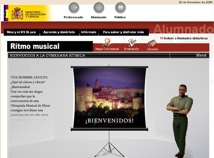 La pantalla de presentación de cada escena presenta el escenario en el que ésta se va a desarrollar. Es una situación concreta donde se ve un dibujo que ilustra la escena o las locuciones de los personajes. A través de los menús que se encuentran en la escena principal se puede acceder a una evaluación inicial (¿Qué sabes de...?) para comprobar los conocimientos que, de entrada, se tienen sobre un tema o acceder directamente a las actividades propuestas.