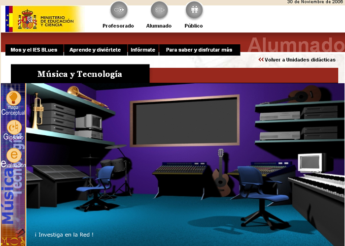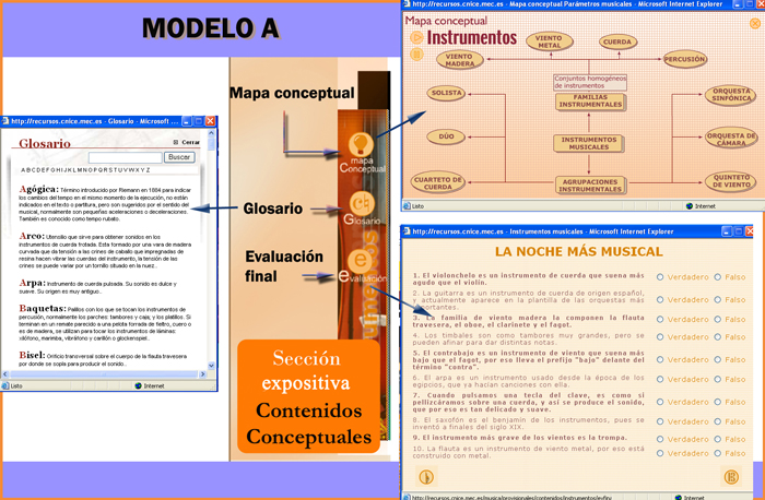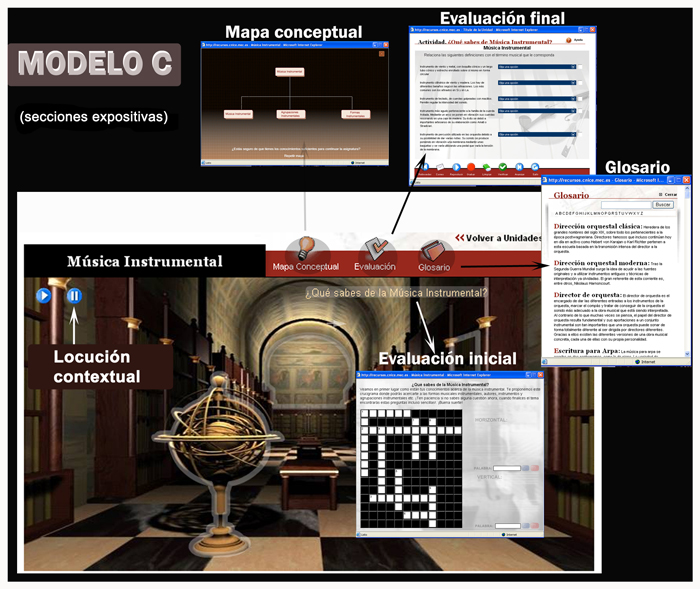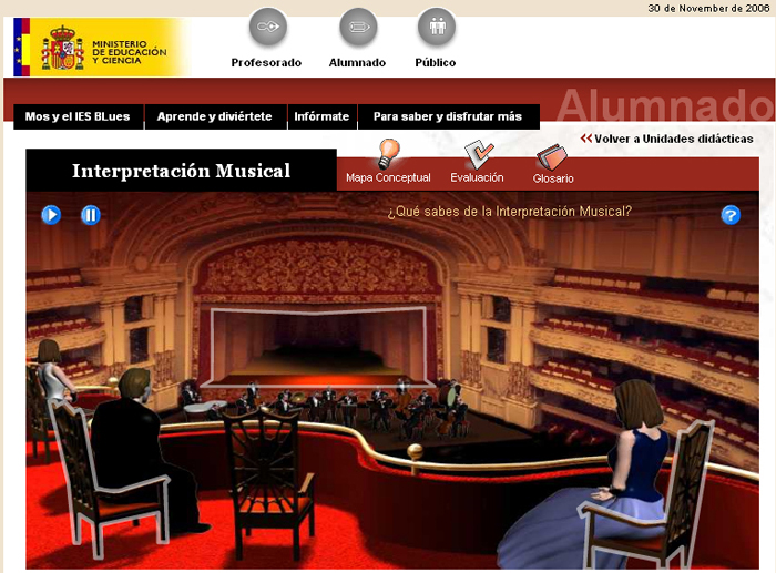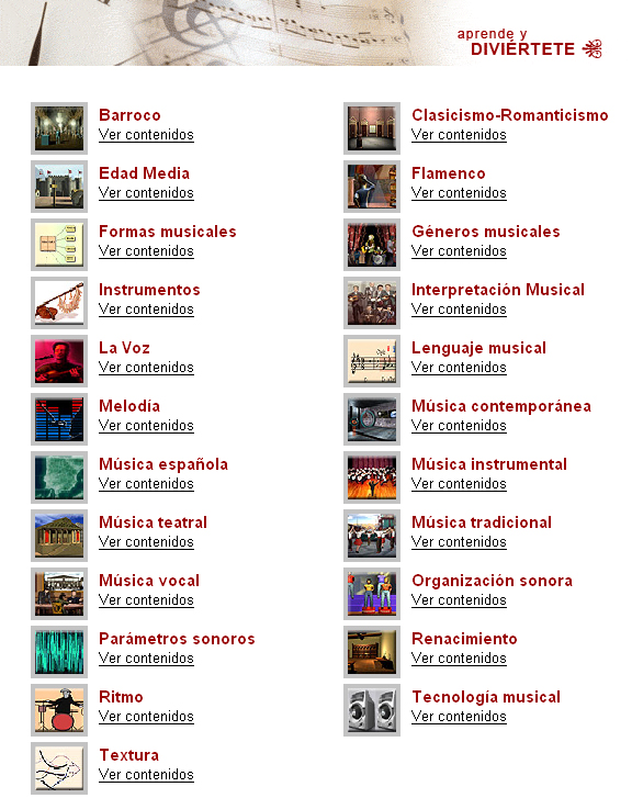 Además, hay una serie de unidades didácticas que abordan los principales ejes temáticos musicales: Música instrumental, vocal y música teatral e Interpretación musical. En ellos la presentación de la información se hace a través de unas entradas temáticas que abordan específicamente un concepto básico.