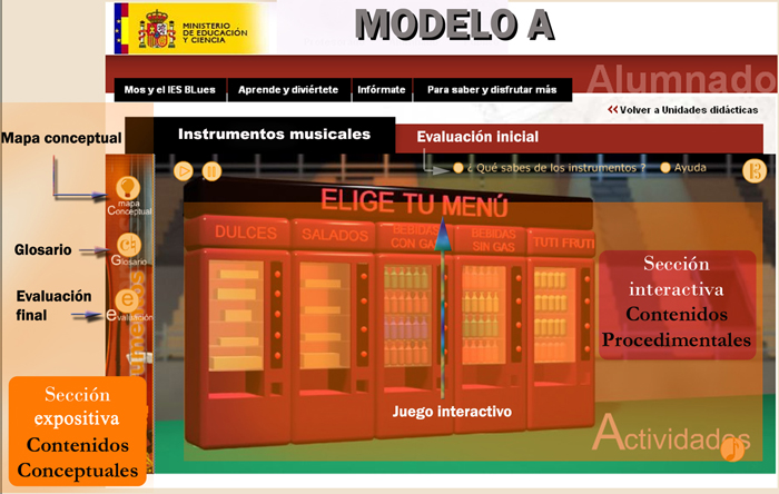Las secuencias didácticas del primer ciclo de la ESO (modelo A) se organizan entorno a una situación contextual basada en el ambiente cotidiano del alumno y están relacionadas entre sí por la continuidad que ofrece el personaje Mos y su escenario de referencia. En la siguiente secuencia de imágenes se detalla la estructura y se indican cuáles son los enlaces a los distintos apartados, así como los niveles de interactividad que tienen las diferentes actividades y objetos de aprendizaje.