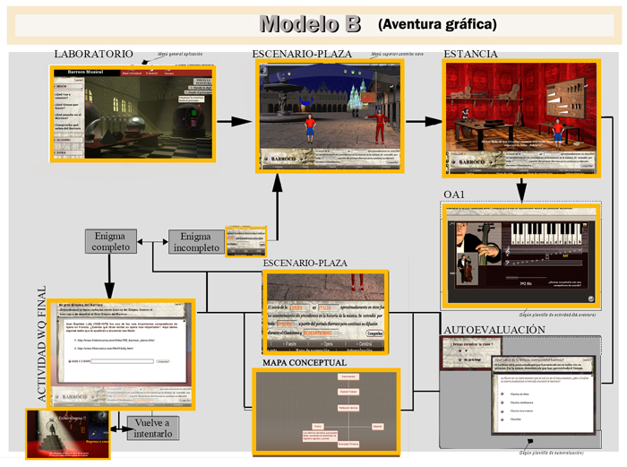 Mapa activo del itinerario de una secuencia didáctica de modelo B: aventura gráfica del Barroco musical