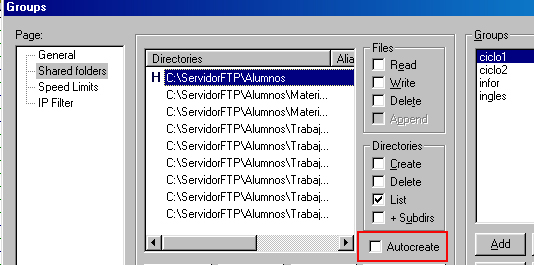 Shared folders la ruta del directorio base (en el que pretenden crearse los subdirectorios de cada uno de los usuarios pertenecientes al grupo)