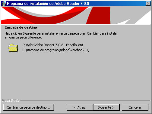 Este nuevo cuadro que aparece nos indica la carpeta en la que se va a instalar Adobe Reader. Si queremos seleccionar otra carpeta diferente hacemos clic en el botón Cambiar carpeta de destino y seleccionamos la nueva carpeta. Para continuar hacemos clic en el botón Siguiente. |