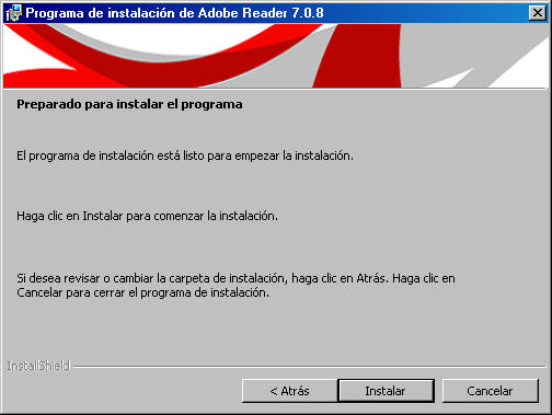 Esta última ventana nos dice que todo está listo para realizar la instalación, si queremos realizar algún cambio hacemos clic sobre el botón Atrás. Para que se inicie la instalación hacemos clic en el botón Instalar y aparecerá el cuadro de progreso de la instalación. |