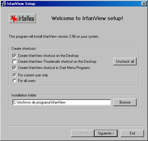Abrimos la carpeta en la que lo hemos guardado y hacemos doble clic sobre él para comenzar la instalación y aparecerá el siguiente cuadro de diálogo en el que nos da la bienvenida y nos permite seleccionar el tipo de accesos directos que queremos crear y para qué usuarios.
