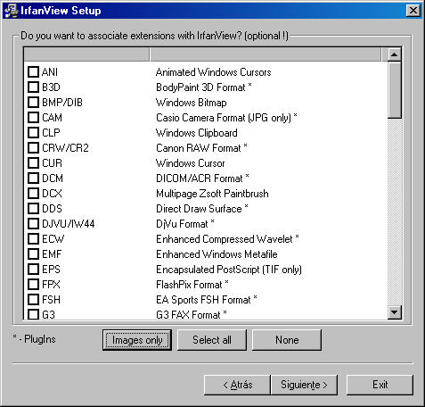 Hacemos clic en el botón Siguiente y aparecerá otro cuadro de diálogo con las diferentes extensiones de ficheros que podemos asociar a esta aplicación.