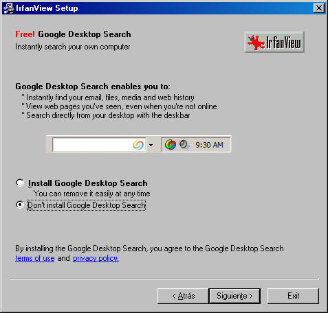 Inicialmente no viene marcada ninguna opción. Vamos a dejarlo como está y continuamos haciendo clic en el botón Siguiente. Nos muestra otro cuadro de diálogo por si queremos o no instalar Google Desktop Search.