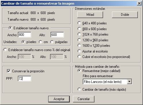 También podemos utilizar las opciones de la derecha donde nos ofrece unos tamaños estándares y unos filtros con los que elegir diferentes tipos de muestreo. |