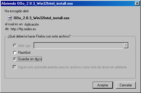 Si utilizamos el navegador Mozilla aparecerá el cuadro de diálogo Abriendo, que vemos en la siguiente figura y en él debemos seleccionar la opción Guardar en disco y hacer clic sobre el botón Aceptar.