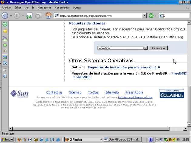 Hemos descargado la suite OpenOffice.org 2.0 en inglés, pero aprovechando que estamos en esta página vamos a descargar el paquete de idioma para convertirla a español. Nos desplazamos al final de la misma y encontraremos lo que nos muestra la figura siguiente.