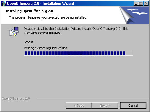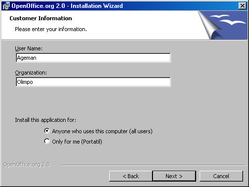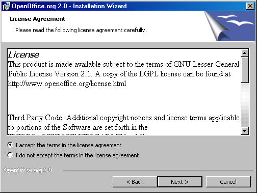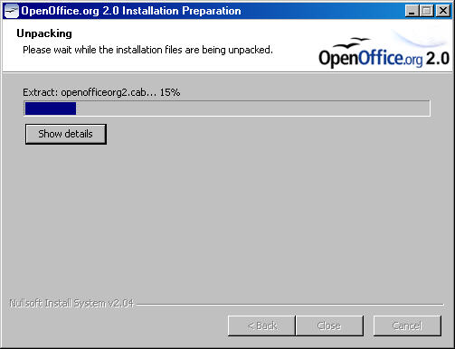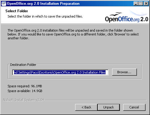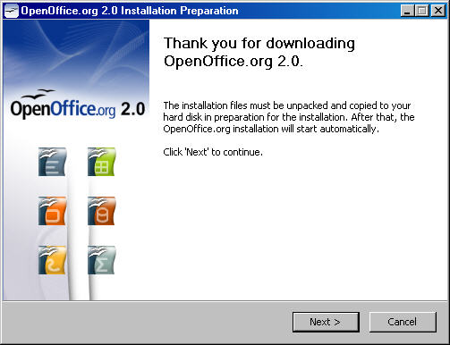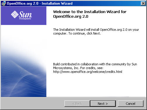 Cuando termine de desempaquetar todos los ficheros aparecerá el cuadro de diálogo de bienvenida a la instalación de OpenOffice 2.0 que se muestra a continuación.