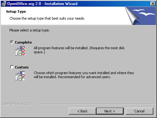 La instalación Complete es la más cómoda y fácil de realizar. La instalación Custom es para usuarios más avanzados y muestra otro cuadro de diálogo en el que es preciso seleccionar las aplicaciones de la suite que queremos instalar así como las diferentes utilidades. Seleccionamos instalación Complete y hacemos clic en el botón Next para avanzar un paso más.