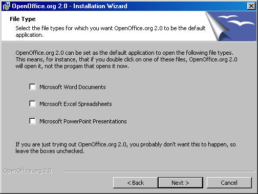 En este cuadro nos ofrece la posibilidad de asociar los archivos de tipo Word, Excel y PowerPoint para que sean abiertos directamente con la aplicación correspondiente de OpenOffice. Si tenemos instaladas estas aplicaciones conviene que dejemos estas casillas sin activar. Hacemos clic en el botón Next para continuar.