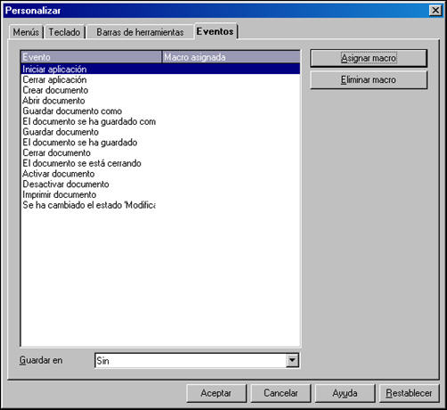 | Desde la pestaña Eventos del cuadro de diálogo Personalizar, que vemos en la figura 15.23, podemos asignar macros a las acciones del programa. Estas macros se ejecutarán de forma automática cada vez que se ejecute la acción seleccionada. |
