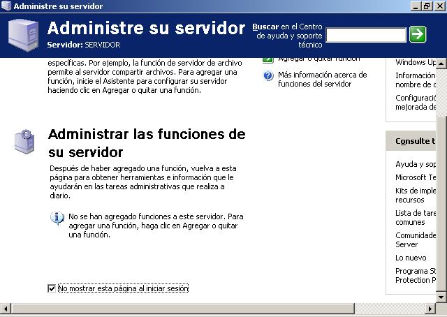 La primera ventana que nos muestra "Windows 2003 Server" es la siguiente, en la que activaremos la casilla "No mostrar esta página al iniciar sesión", para posteriormente cerrar la ventana.