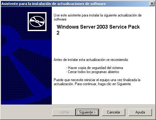 Una vez completado el proceso de descompresión y verificación del fichero descargado, se mostrará la siguiente ventana en la que tras pulsar en el botón "Siguiente" dará comienzo el proceso de instalación del SP2 para "Windows 2003 Server".
