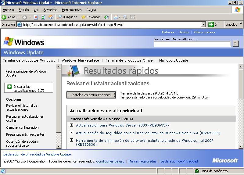 Tras completarse la acción anterior, será cargada la página de actualización de Microsoft "Windows Update", pudiendo comenzar el proceso de instalación de los parches necesarios para nuestro equipo pulsando en la misma sobre el botón "Rápida".