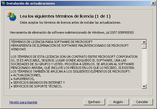 Como resultado de la acción anterior se nos presenta la siguiente ventana que nos informa de los términos de la licencia para la instalación de las actualizaciones, en la cual pulsaremos sobre el botón "Acepto".