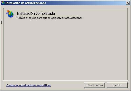 Una vez concluida la instalación de Internet Explorer 7, se continúan instalando el resto de parches en el sistema, y tras la conclusión de todos ellos, pulsaremos sobre el botón "Reiniciar Ahora" en la siguiente ventana para concluir el proceso de instalación de los parches aludidos.