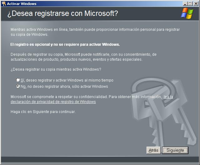 En la nueva ventana mostrada activaremos el radio botón "No, no deseo registrar ahora, sólo activar Windows", y pulsaremos posteriormente sobre el botón "Siguiente".