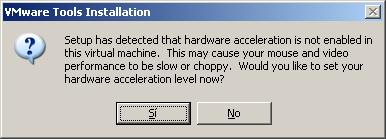En el proceso de instalación, si "VMWare Tools" detecta que no está activada la aceleración de hardware en la máquina virtual, nos pregunta si deseamos hacerlo; pulsaremos en dicho caso sobre el botón "Sí".