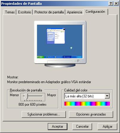 Además del documento anterior, se nos despliega automáticamente la ventana de "Propiedades de Pantalla", en la cual indicaremos la resolución deseada para nuestra máquina virtual ("800x600" en este caso), y tras ello pulsaremos sobre el botón "Opciones avanzadas".