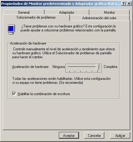 Como resultado de la acción anterior pasa a ser mostrada la siguiente ventana, en la cual nos situamos sobre la pestaña "Solucionador de problemas", para mover el indicador de "Aceleración de hardware" al máximo (Completa), y pulsar tras ello sobre el botón "Aceptar"; a partir de este instante ya habremos activado la aceleración de hardware, completando los pasos que el sistema nos indicó anteriormente mediante el documento de texto correspondiente.