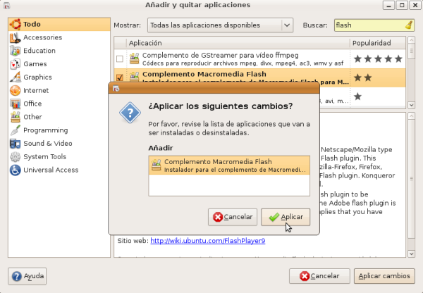 Adobe Flash es una aplicación en forma de estudio de animación que trabaja sobre "Fotogramas" destinado a la producción y entrega de contenido interactivo para diferentes audiencias alrededor del mundo sin importar la plataforma. Actualmente está desarrollado y distribuido por Adobe Systems, y utiliza gráficos vectoriales e imágenes ráster, sonido, código de programa, flujo de vídeo y audio bidireccional. En sentido estricto, Flash es el entorno y Flash Player es el programa de máquina virtual utilizado para ejecutar los archivos generados con Flash. Los archivos de Flash, que tienen generalmente la extensión de archivo SWF, pueden aparecer en una página web para ser vista en un navegador, o pueden ser reproducidos independientemente por un reproductor Flash. En este caso instalaremos el plugin para Mozilla Firefox. Para instalarlo abriremos el instalador de aplicaciones. En el desplegable "Mostrar" seleccionamos "Todas las aplicaciones disponibles", y en el cuadro de diálogo Buscar del instalador de aplicaciones escribimos flash y rápidamente veremos que aparece la aplicación buscada. Marcamos la casilla de verificación y pulsamos el botón de Aplicar cambios.