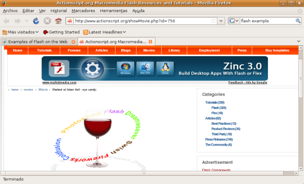 Para probar que funciona el plugin para Firefox, abriremos el navegador y en la casilla del buscador Google escribiremos flash example. Cargaremos uno cualquiera de los ejemplos que aparezcan y comprobaremos si se reproduce la animación.