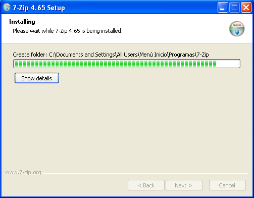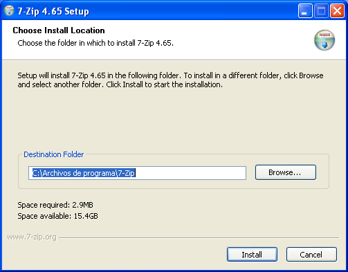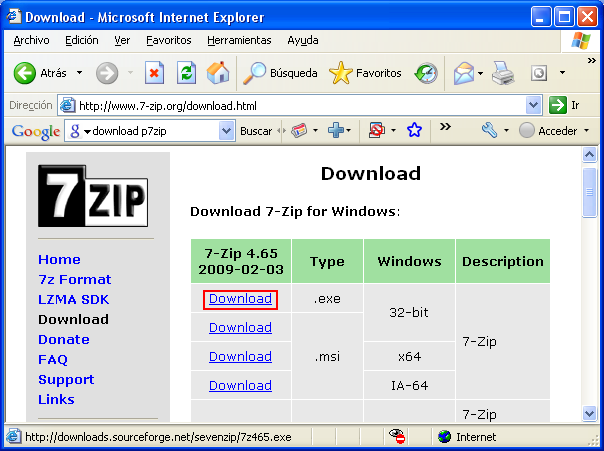En el momento de desarrollar este apartado existía en la red la posibilidad de descargar de modo gratuito una versión del compresor 7-Zip para Windows y Linux desde la URL "http://www.7-zip.org/download.html", concretamente para Windows la última versión disponible era "7-Zip 4.65", versión que procederemos a instalar en este apartado.