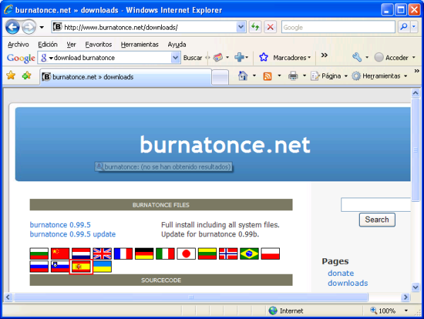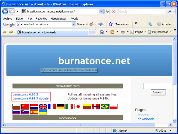 Además de ello, una vez instalada la aplicación, podremos utilizar sus menús de ayuda en español mediante el "fichero de ayuda de BurnAtOnce en español", que puede ser descargado pinchando sobre la bandera de España en la ventana de la siguiente imagen.