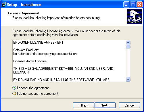 Llegados a este punto ya podremos lanzar la aplicación "BurnAtOnce", haciendo doble clic sobre el acceso directo "burnatonce" existente en el Escritorio de nuestro equipo Windows XP Professional, pasando en primer lugar a ser mostrada la siguiente ventana como resultado de dicha acción; en ella seleccionaremos el radio botón "I am a non commercial user and accept the terms of the license agreement" para indicar que no vamos a hacer un uso comercial de esta aplicación, y posteriormente pulsaremos sobre el botón "Next >".