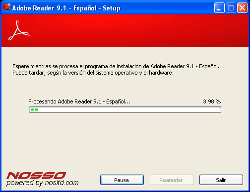Así pues autenticados en nuestro equipo cliente Windows XP Professional con las credenciales del usuario "Profesor", procederemos a copiar el fichero de instalación "AdbeRdr910_es_ES.exe" del producto "Adobe Acrobat Reader 9.10" en el Escritorio de dicho equipo, para posteriormente hacer doble clic sobre el mismo, pasando a ser mostrada la primera ventana del asistente de instalación, que procederá de modo automático a la descompresión del producto para su posterior instalación, tal y como vemos en la ventana de la siguiente imagen.