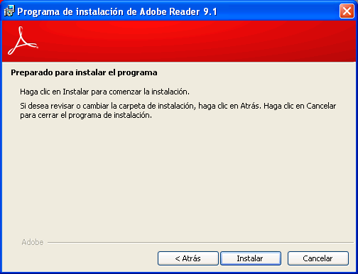 Tras ello el asistente nos informará de que se encuentra en disposición de comenzar a instalar la aplicación "Acrobat Reader 9.1", luego pulsaremos en la ventana de la imagen inferior sobre el botón "Instalar" para dar comienzo a dicho proceso de instalación.
