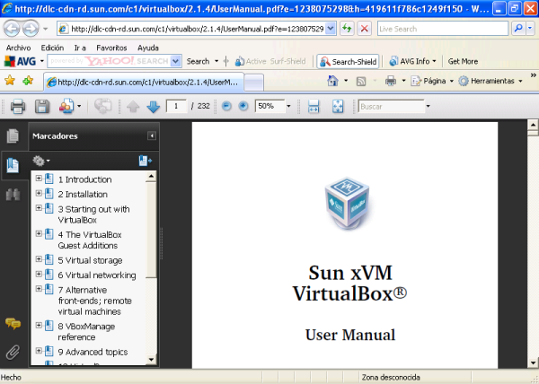 Podremos comprobar que el lector de documentos PDF ha quedado satisfactoriamente instalado en nuestro equipo, procediendo a leer cualquier documento existente en formato PDF en nuestro equipo; por ejemplo si accediéramos desde el navegador del mismo a la URL "http://download.virtualbox.org/virtualbox/2.1.4/UserManual.pdf", podríamos visualizar el contenido del manual de usuario del producto "VirtualBox".