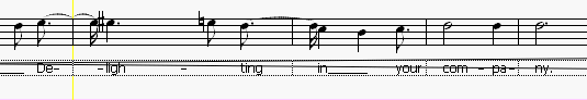 Para introducirla iremos hasta el lugar del pentagrama del piano donde se encuentra la primera nota y , justo debajo, entre los dos renglones del texto haremos clic con el botón izquierdo del ratón. Aparecerá un cursor justo en esa posición y podremos introducir con el teclado el texto de la sílaba correspondiente a esa nota: