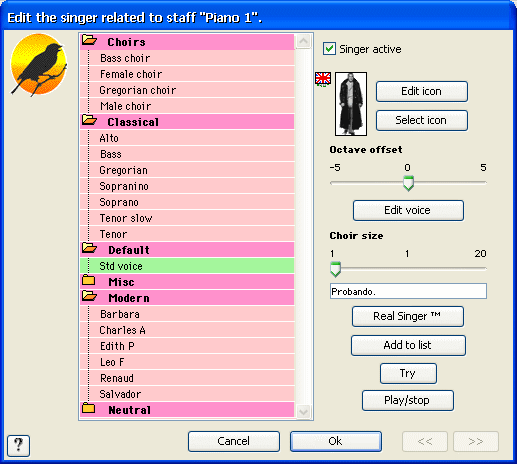 En esta ventana aparecen muchas opciones para seleccionar y/o modificar la voz del cantante. No entraremos a describir todas ellas (sobre todo las funciones más complejas del programa que se encuentran al pulsar Edit voice) pero sí comentaremos las siguientes: