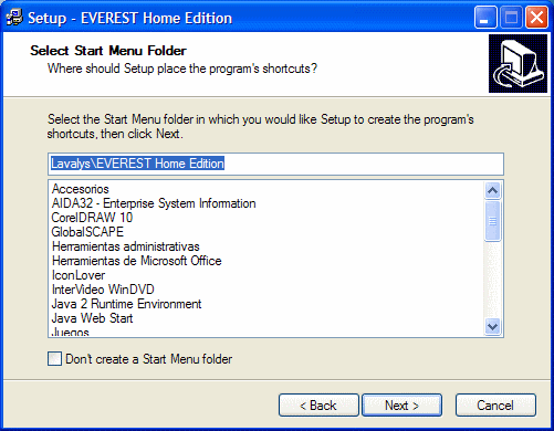 Nos informa del lugar donde se crearán los iconos de acceso al programa. También podemos modificarlo pero no lo haremos. Pulsamos en el botón Next>.