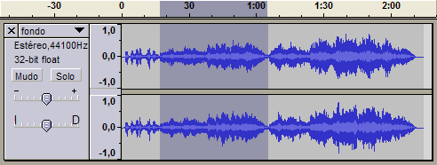 Vamos a seleccionar sólo un fragmento. El archivo fondo.wav dura 2' 14" y vamos a intentar seleccionar un fragmento que ronde el minuto. La música se inicia con unos timbales y luego entra el tema principal y único interpretado por el oboe, para luego repetirse con alguna ligera variación. Es decir, en este archivo hay tres zonas claramente delimitadas que se distinguen incluso en la representación gráfica de la pista. Visualmente se observa además que, el momento en que se va a producir la transición entre el redoble de los timbales y el comienzo de la melodía y la transición entre dicha melodía y su repetición coinciden con un descenso en el volumen.