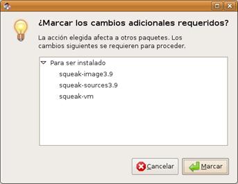 Como resultado de la búsqueda, en la ventana principal de Synaptic se mostrará una relación de paquetes en la que deberemos localizar squeak y marcarlo para su instalación.
