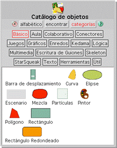 El Catálogo de objeto es una colección de objetos que podremos incorporar a nuestros proyectos. Para utilizarlo, pulsaremos sobre el botón abre el Catálogo de objetos que podemos encontrar en la zona superior derecha del Panel de Squeak. Al pulsar el botón se nos mostrará en pantalla la ventana del Catálogo de objetos.