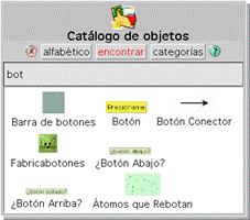 - categorías: Por defecto, el Catálogo de objetos aparece agrupado por categorías e inicialmente abierto por la categoría Básico. Haciendo clic en cualquiera de las categorías se verán los iconos de todos los objetos de esa categoría.