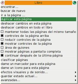 Una forma rápida de crear una página nueva reutilizando el trabajo anterior es pulsando sobre el botón central del libro y seleccionar la opción duplicar esta página. Como resultado observaremos que se ha creado una nueva página idéntica a la anterior.