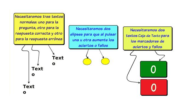 Recuerda que debes usar dos elipses, una para que al pulsarla (debes cambiar normal por ratónAbajo) incremente los aciertos y otra para que incremente los fallos. Además, usarás dos Cajas de Texto, uno para los aciertos y otro para los fallos. Por último, también necesitarás tres “Texto normal”; uno para la pregunta y dos para las respuestas.