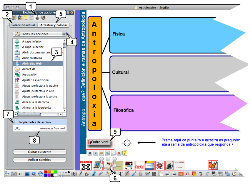 - Objeto seleccionado, que es una imagen del diccionario de la RAE. En modo diseño los objetos que tienen asociada una acción aparecen resaltados con un recuadro rojo. En este caso, el objeto seleccionado tiene asociada la acción "Abrir sitio web" (paso 3) y, en concreto, la web establecida en "Propiedades de acción" (paso 7) en el recuadro (paso 8) que es la web de la RAE.